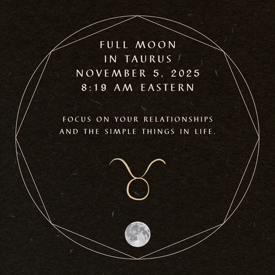 Date: November 5, 2025 Add to Calendar Google CalendarMicrosoft OutlookApple CalendarDownload Time: 8:15 am - 8:20 am Calendar: Sun and Moon Dates Full Moon in Taurus at 8:19am